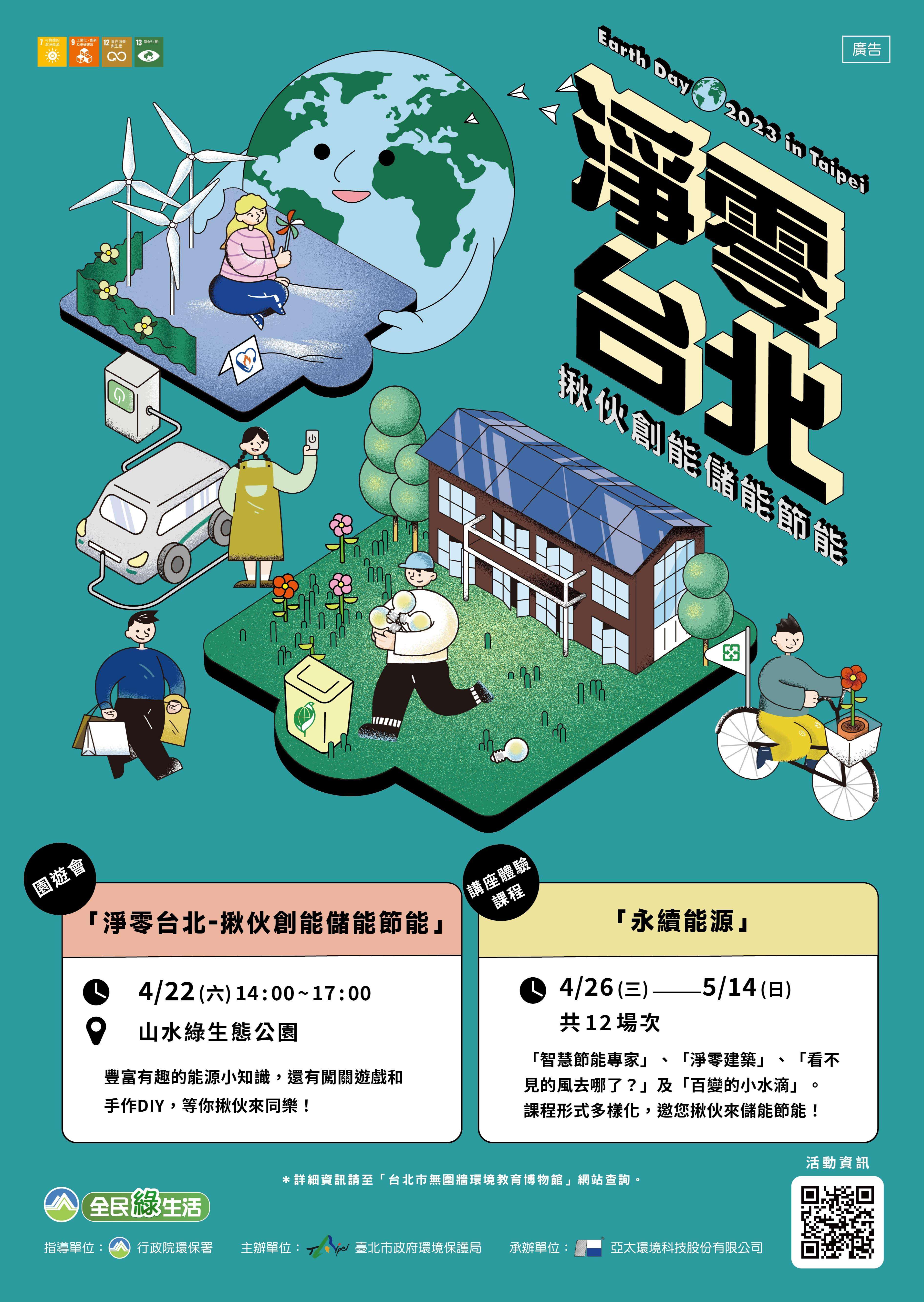 為響應地球日,本局將在4月22日(六)地球日當日下午2 時至5時,於本市南港山水綠生態公園辦理「淨零台北-揪 伙創能儲能節能」園遊會,現場設有攤位闖關活動,闖關 成功者還可獲得精美小禮。另於4月26日(三)至5月14日 (日)辦理「永續能源講座」,邀請專業團隊,與民眾分 享創能、儲能、節能及綠色建築於生活中之應用,活動簡 述如下:
