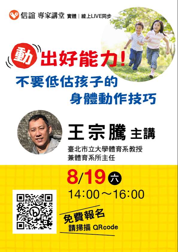 一、足夠與正確的身體動作能力,不僅為孩子的好體力打底,更可以提升孩子的學習能力,是活化大腦、穩定情緒的重要途徑!信誼基金會以此為題,於2023年8月19日(六)舉辦【「動」出好能力!不要低估孩子的身體動作技巧】講座,本講座同時採用實體與線上課程進行,邀請爸媽及老師免費報名參加。