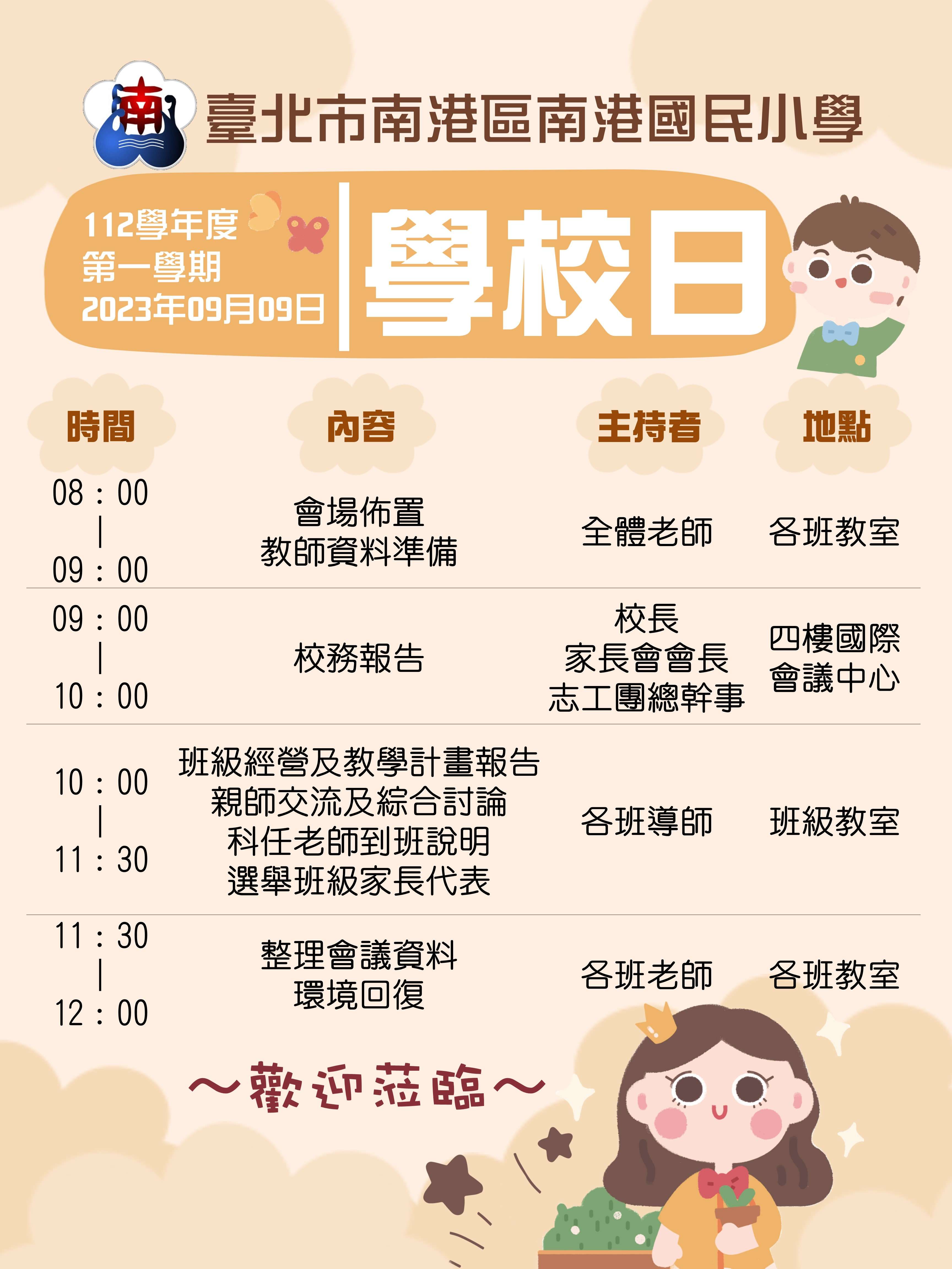 本校謹訂於9/9(六)9:00-11:30舉辦學校日活動,透過親師交流,讓彼此能更了解孩子的生活與學校的活動,建立起親師教育夥伴關係,這也是親師雙方難能可貴的相聚時刻,我們誠摯邀請您蒞臨本校,詳細活動流程如附圖。