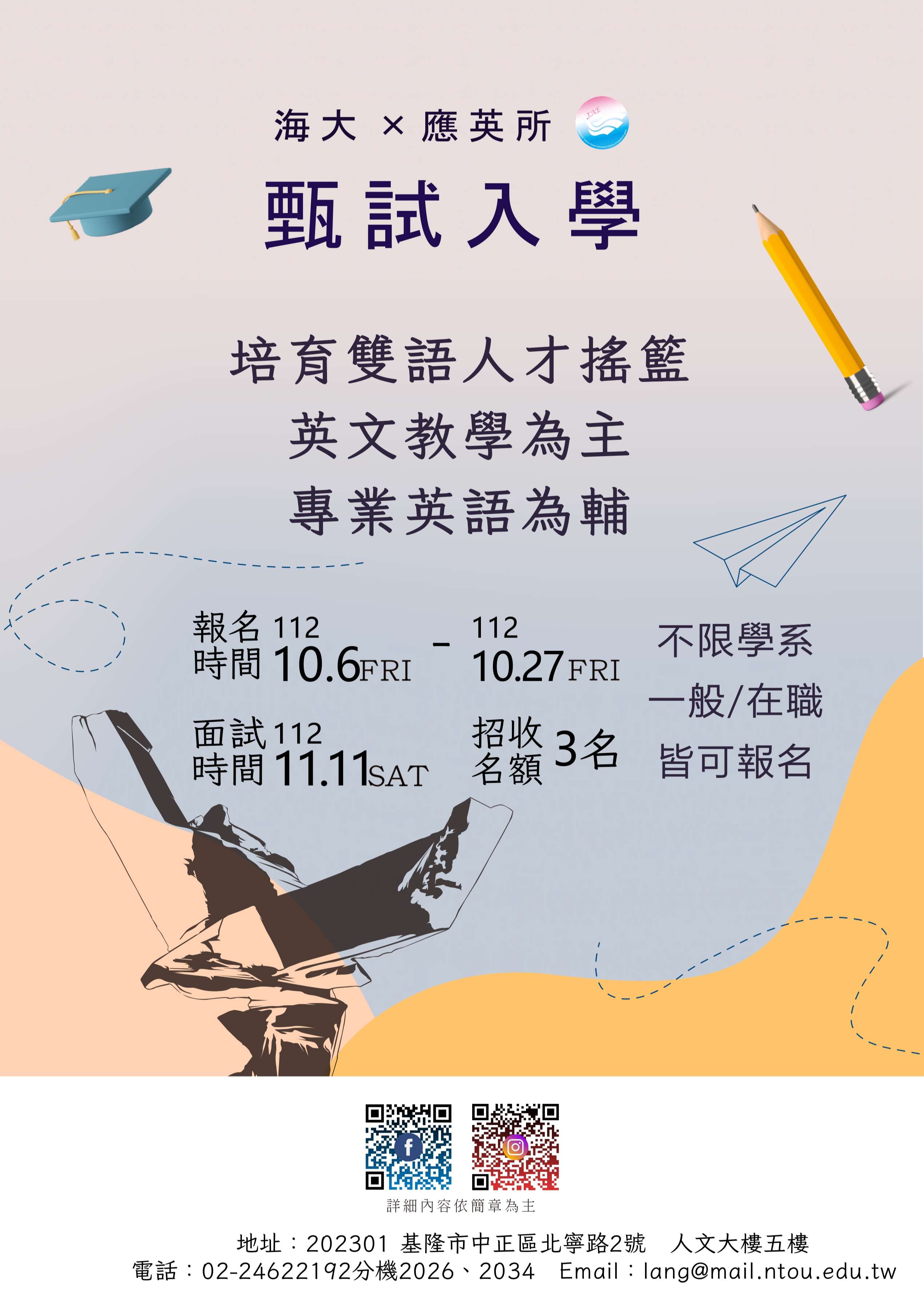 一、因應2030雙語國家政策,英語能力將成為就業必備條件之 一。海大應用英語研究所以英語教學訓練爲主,專業英語 為輔,適合對英語教學有興趣或未來職業欲使用英語者就 讀。