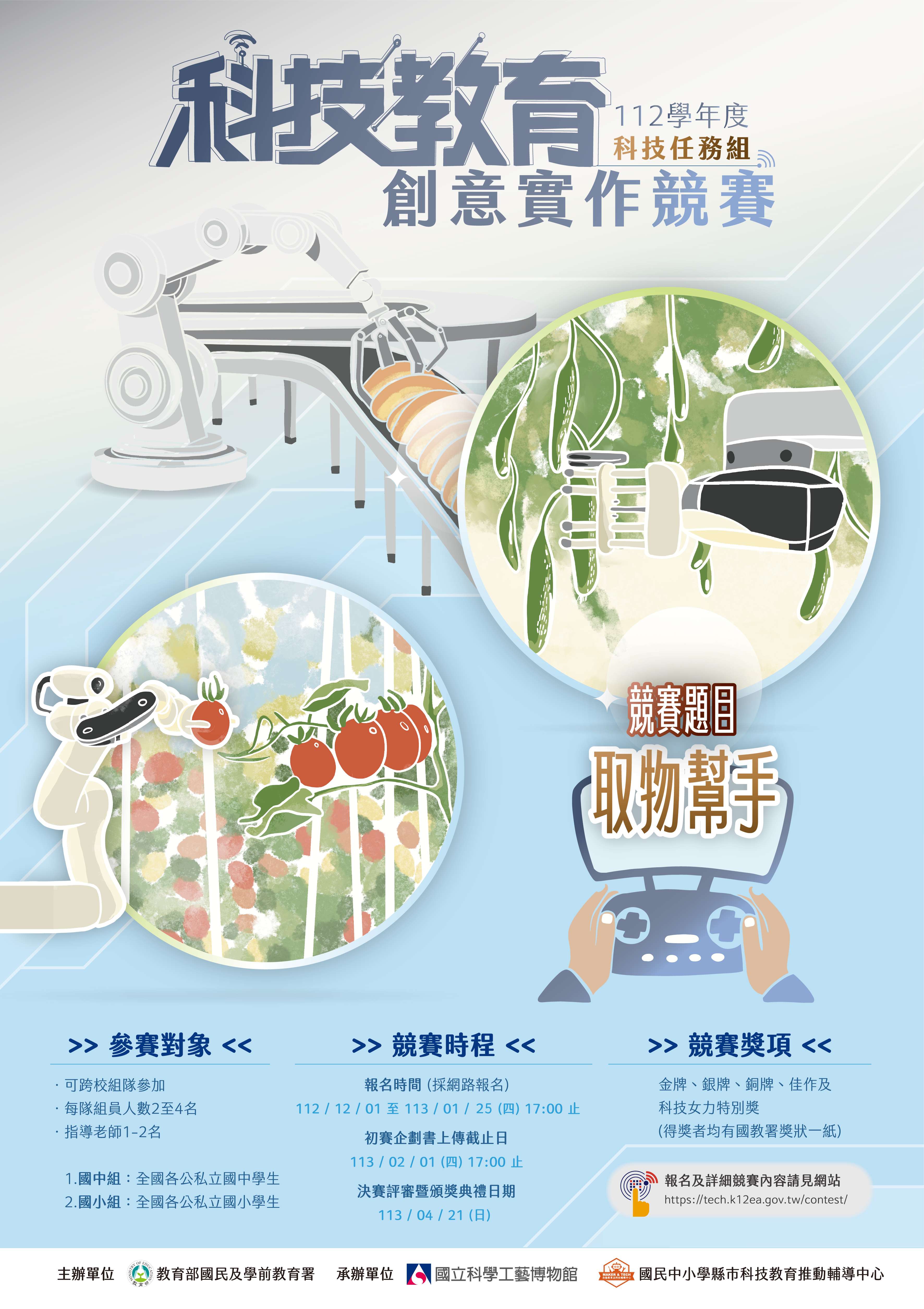 一、競賽原報名時間至112年1月18(星期四)截止,現延 長至113年1月25日(星期日)下午5時止,競賽資訊詳見競 賽網站(網址:https://tech.k12ea.gov.tw/contest/),請師生踴躍報名參加。