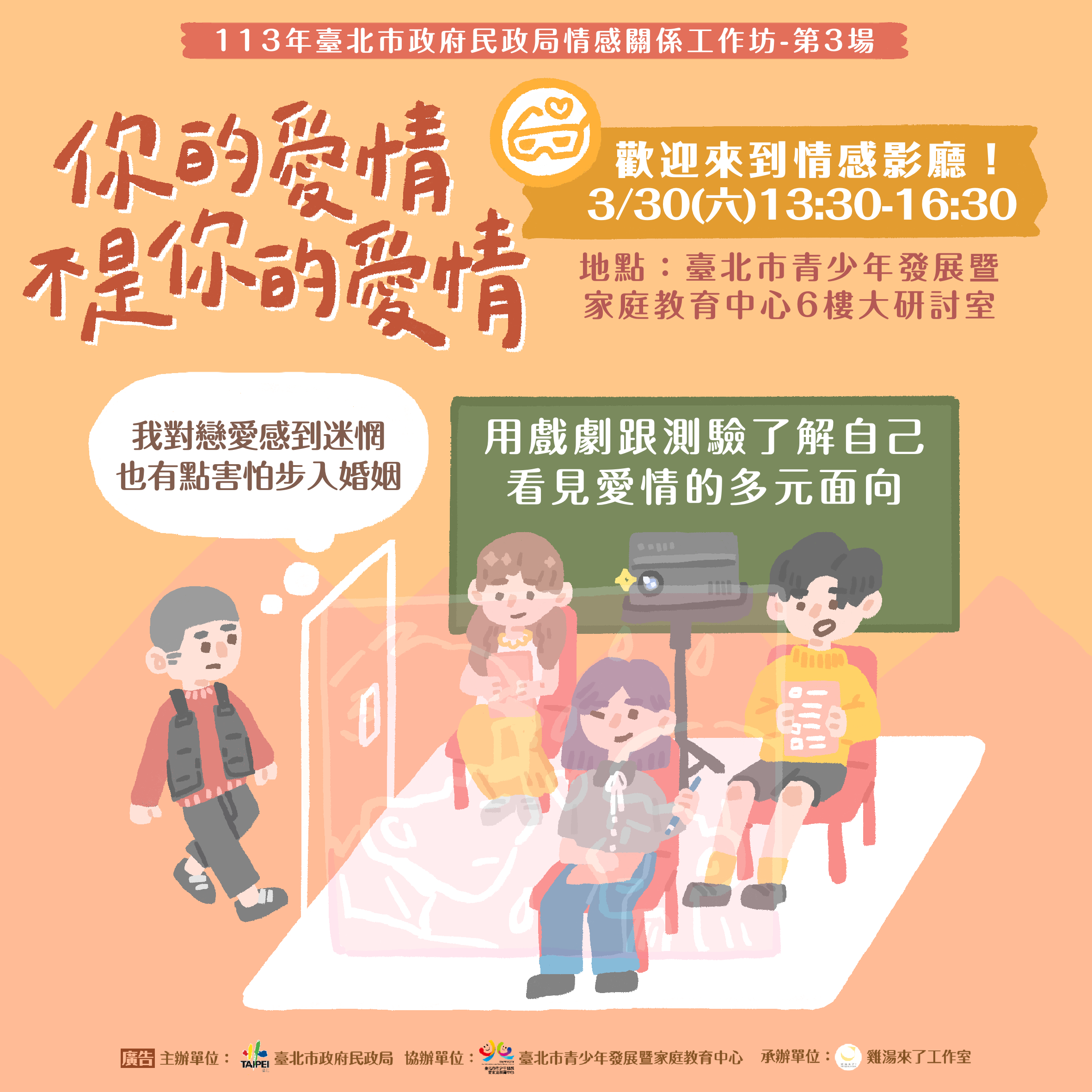 轉知臺北市政府民政局113年情感關係工作坊第3場次。