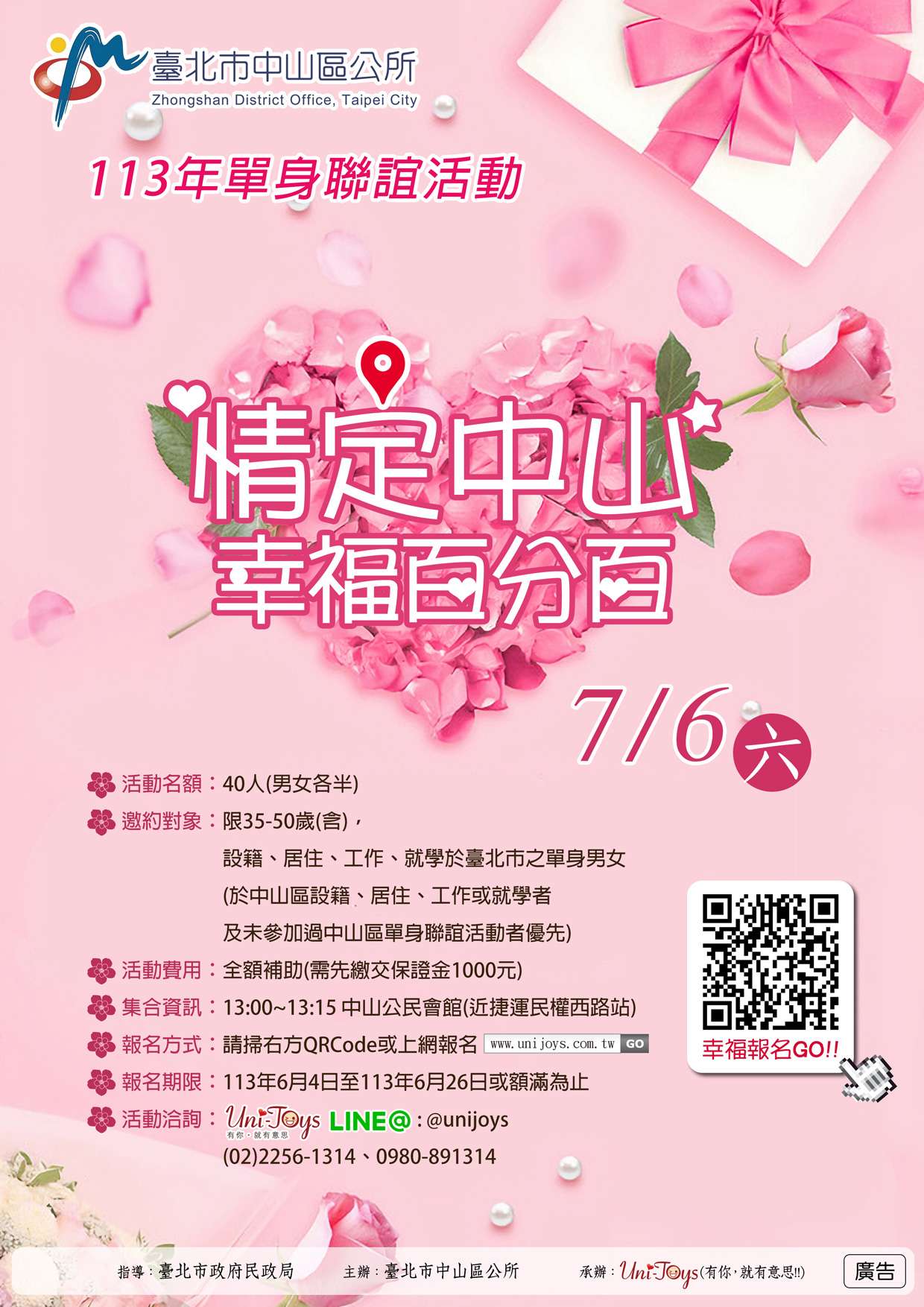 轉知臺北市中山區公所113年度「情定中山 幸福百分百」 單身聯誼活動。