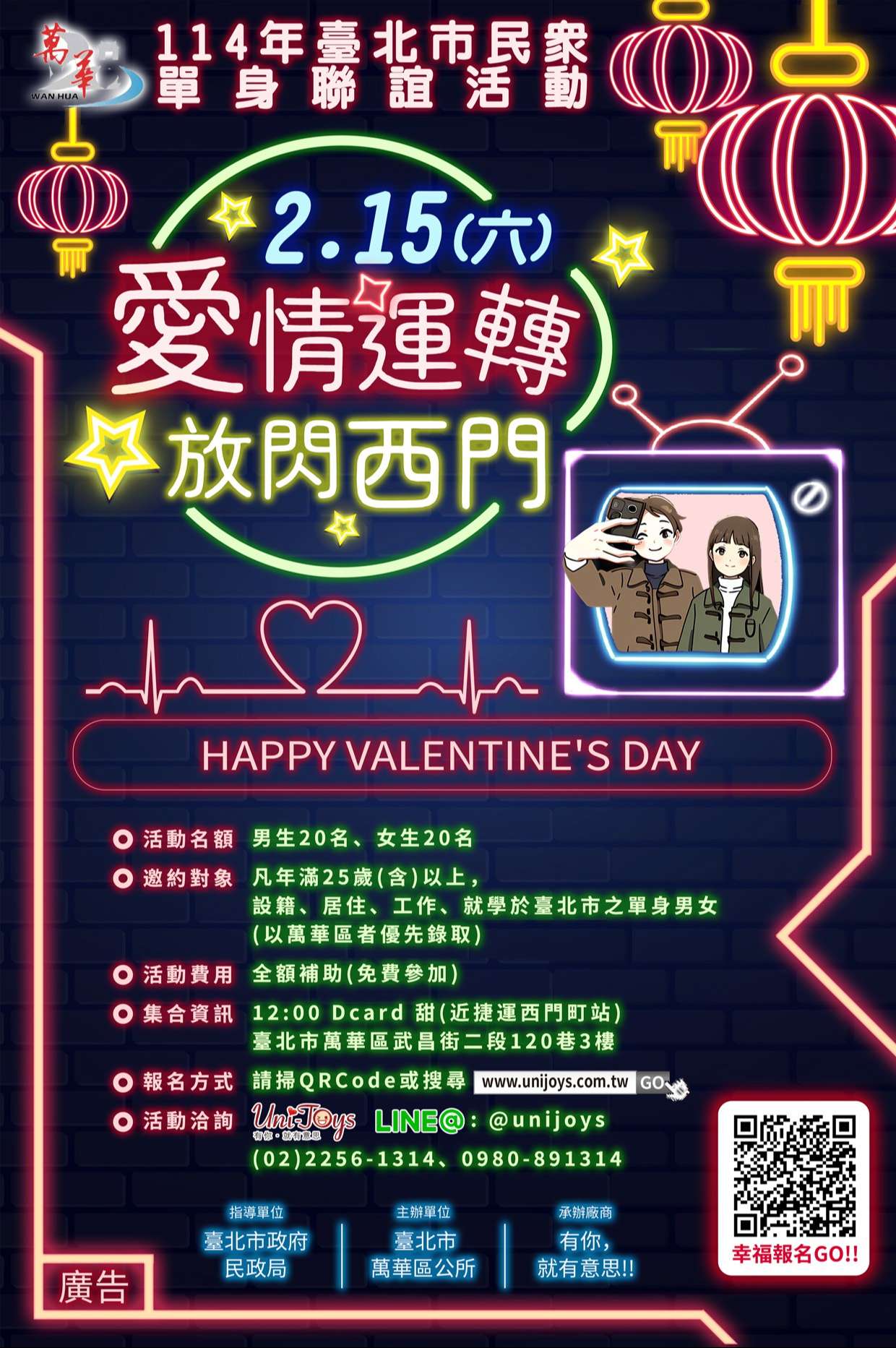 轉知114年度萬華區公所單身聯誼活動「愛情運轉放閃 西門」