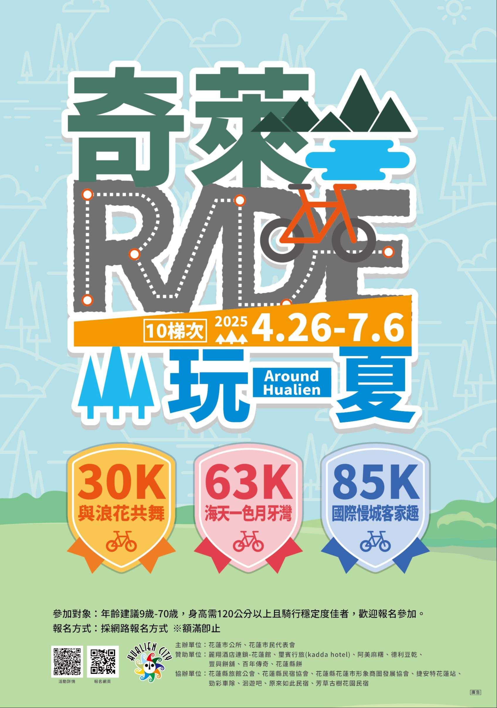 主旨:函轉花蓮縣花蓮市公所辦理2025「奇萊玩一夏」自行車輕 旅行活動,敬請協助宣傳周知,請查照。 說明: 一、依據花蓮縣花蓮市公所114年2月6日花市文字第1140002895 號函辦理。 二、旨案報名日期114年2月27日(四)起至網路報名額滿即止。 三、活動日期114年4月26日至7月6日共10梯次。 四、活動訊息請逕上官網https://reurl.cc/nqAO06查詢。