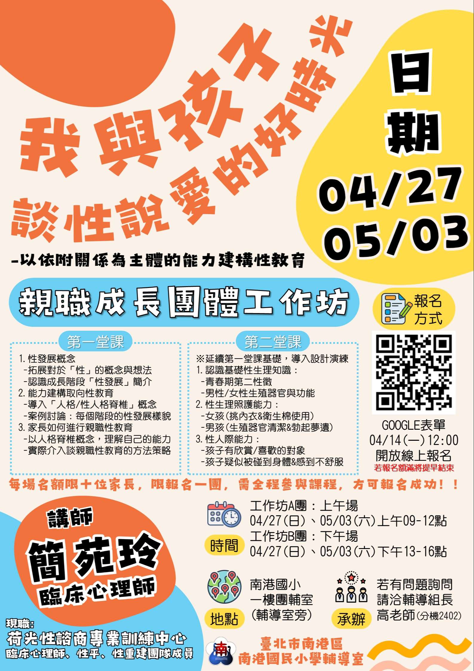 對此,本校輔導室安排了親職教育工作坊,透過兩個周末的半天時間裡,由心理師說明性發展的概念,以及能力建構概念,幫助家長理解孩子們的發展,同時固定自己作為家長的位置,知道進行性教育時,有哪些資源可以使用、有哪些注意事項。邀請您一起參與、共好、成長!