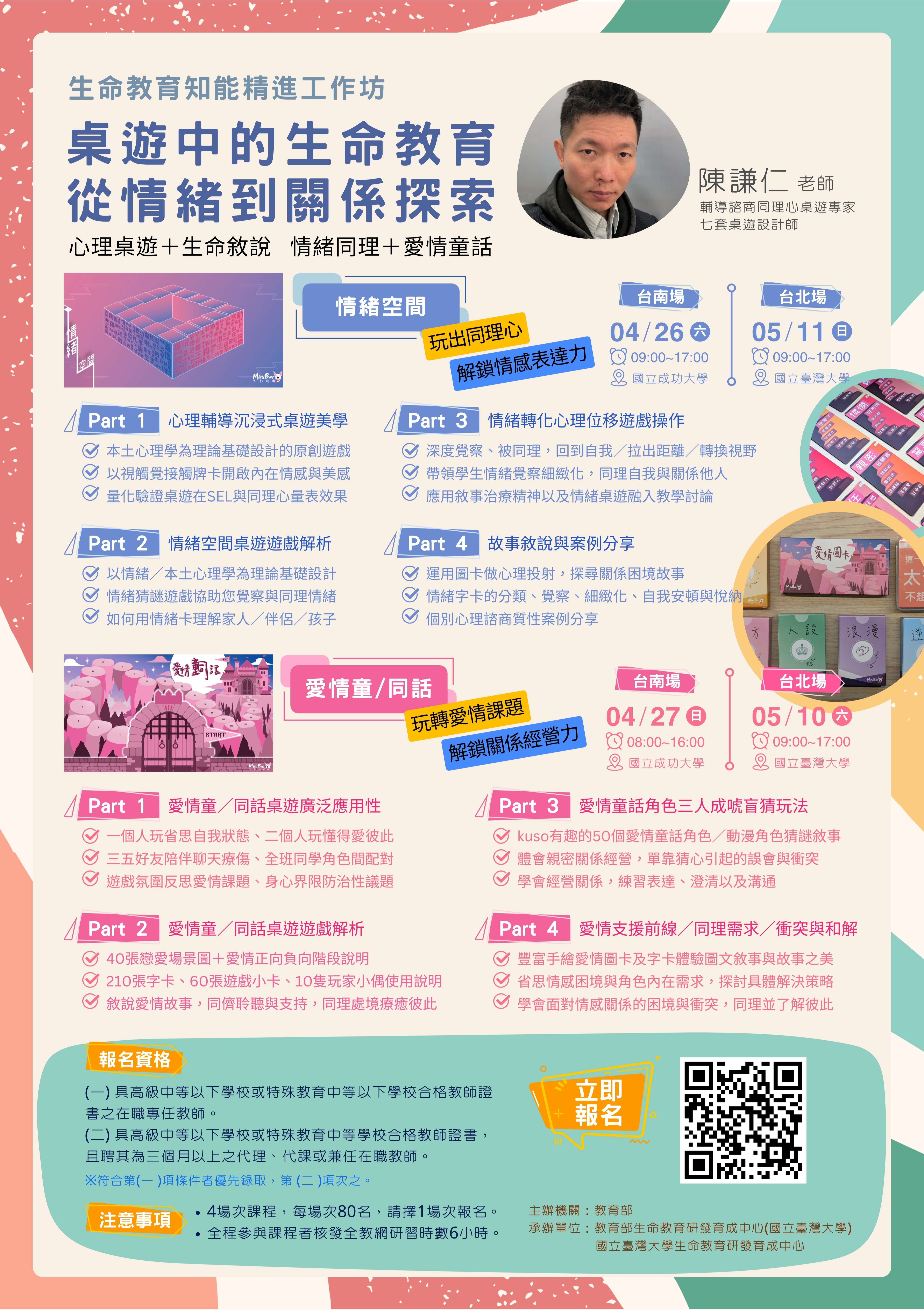 【轉知】國立臺灣大學生命教育研發中心辦理「桌遊中的生命教育-從情緒到關係探索工作坊」研習訊息,詳細內容請參閱附件檔案。