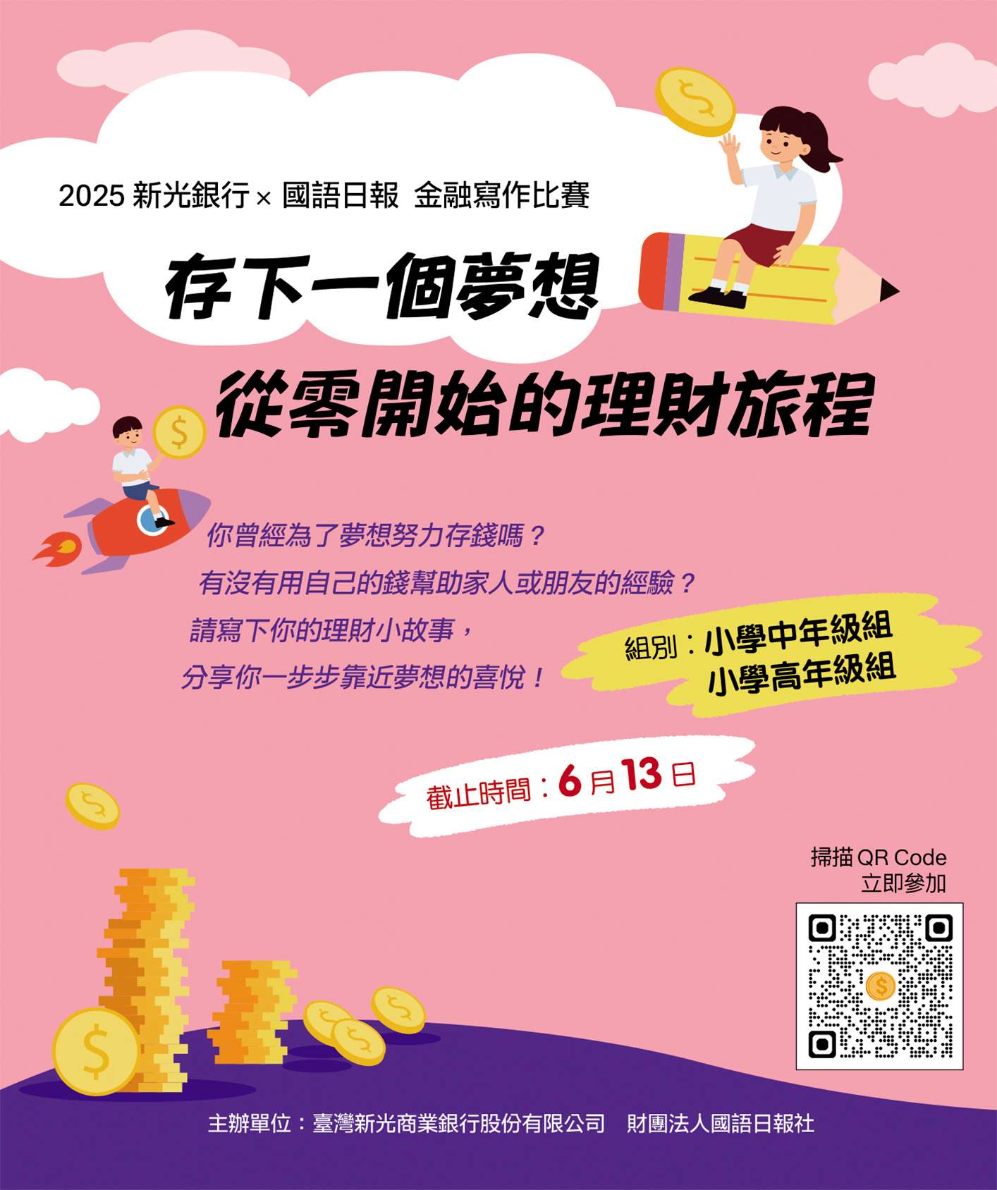 一、為提升兒童的財商素養,讓孩子了解金錢的價值與管理能力,國語日報社與臺灣新光商業銀行共同舉辦「存下一個夢想 從零開始的理財旅程」徵文活動。