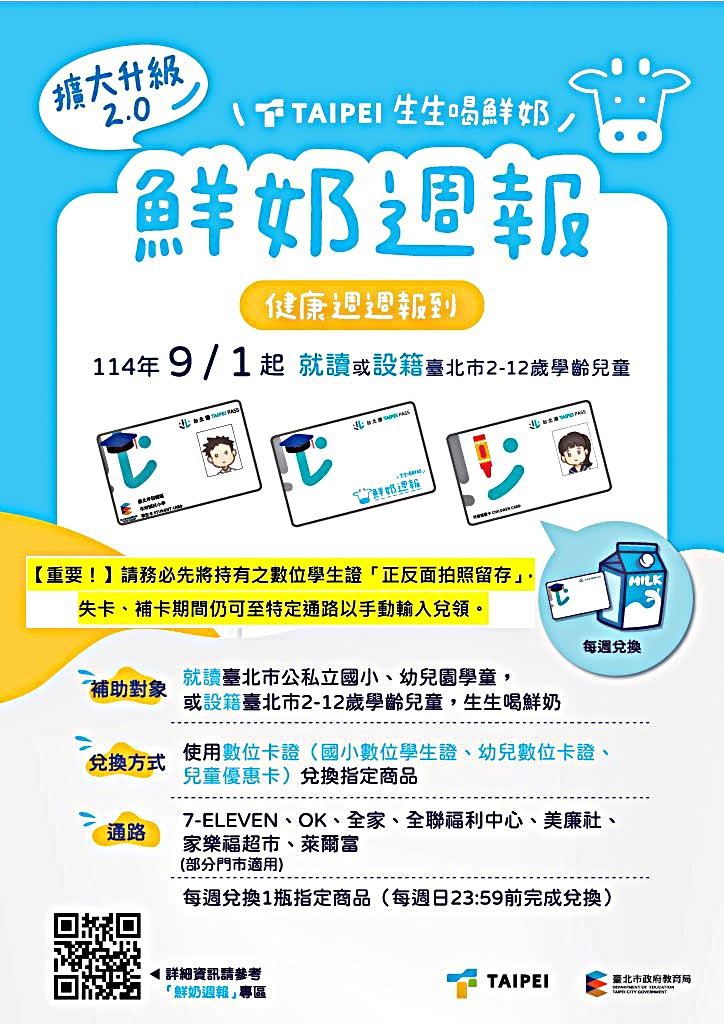 鮮奶週報 9 月 1 日擴大升級!【就讀或設籍臺北市】 2-12 歲學齡兒童,憑數位卡證至指定通路即可兌換鮮奶或豆漿!