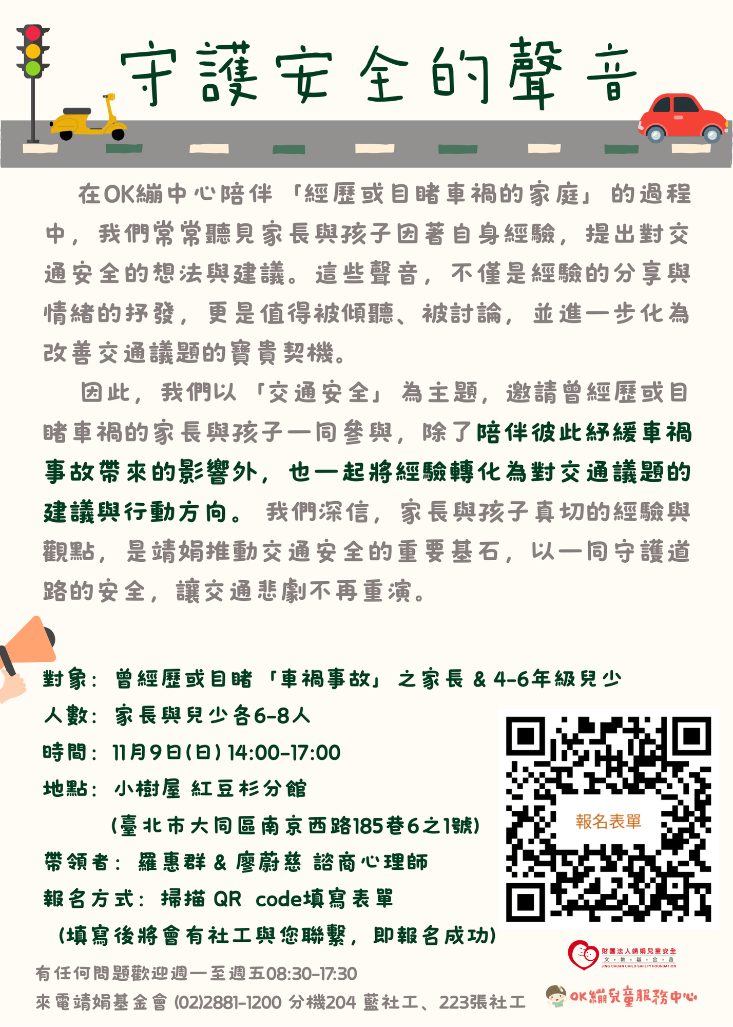 靖娟基金會OK繃兒童服務中心將於114年11月9日14時至17 時辦理以「交通安全」為主題之團體活動,邀請曾經歷或目睹車禍之家長及兒少共同參與,期協助家長及兒少紓緩事故影響之餘,也能凝聚意見並討論交通環境的改善方向。