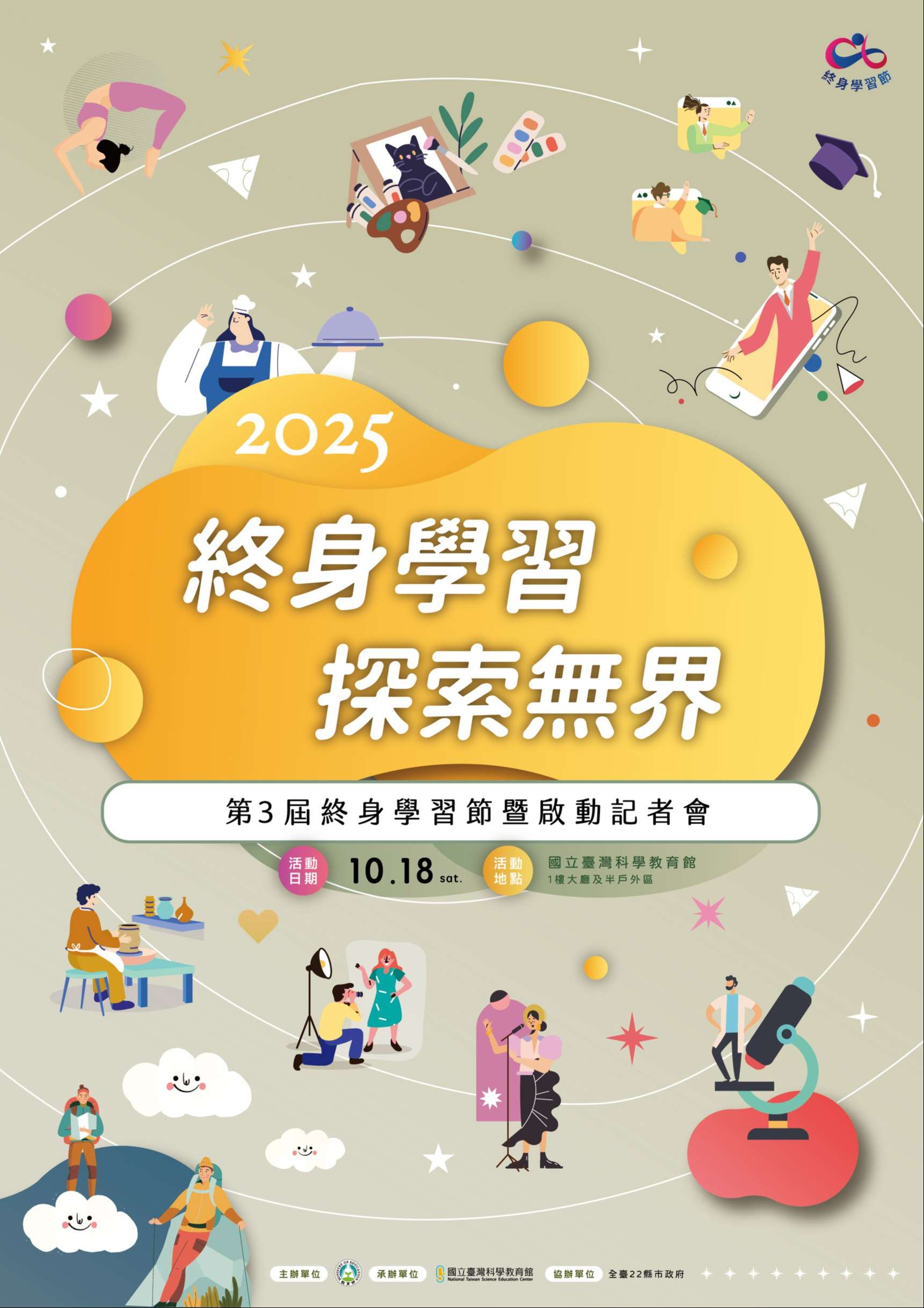 三、本年度活動主題為「終身學習,探索無界」,內容包含啟 動記者會、頒獎表揚、終身學習集章市集與工作坊等多元 活動。