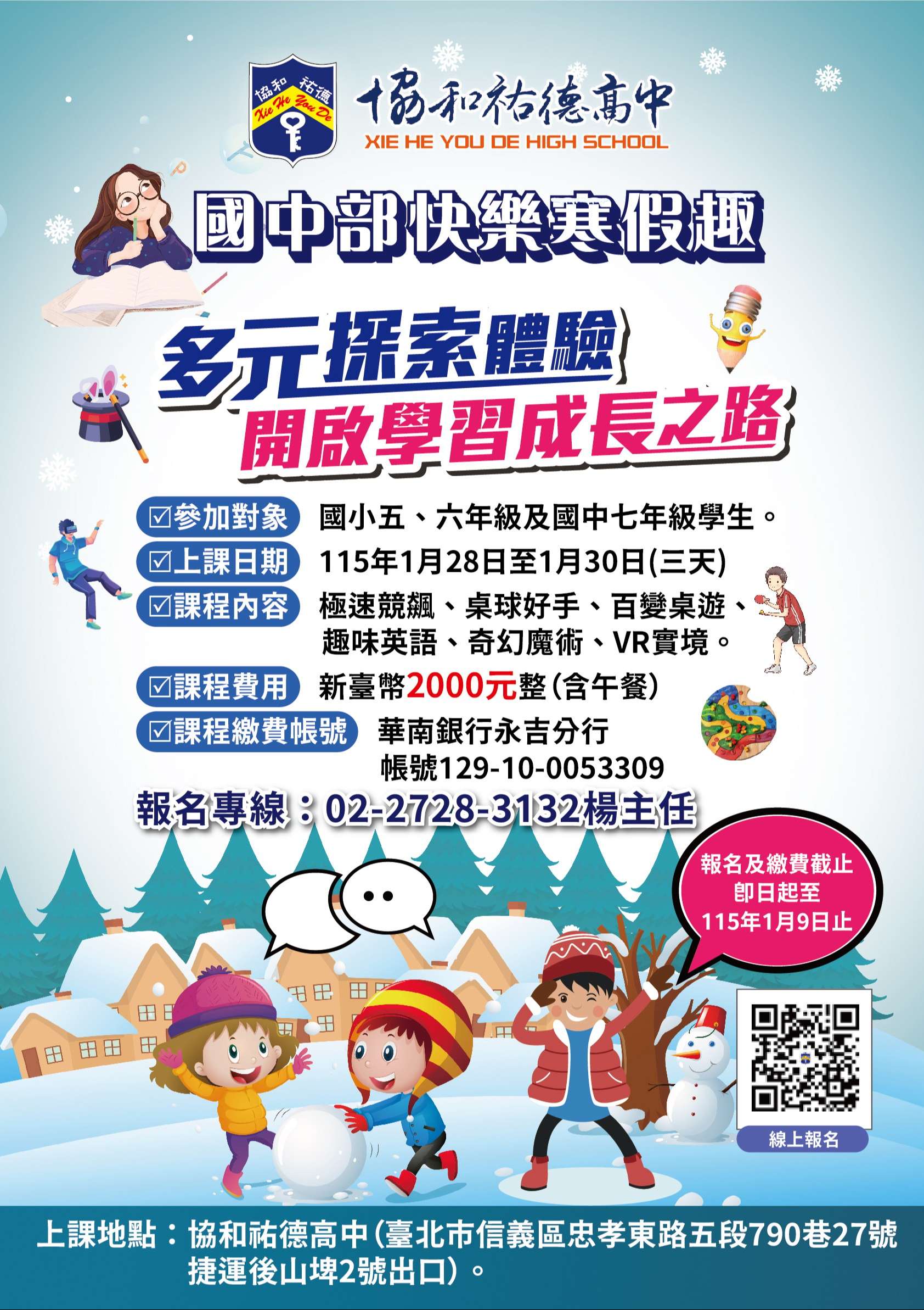 臺北市協和祐德高級中等學校將舉辦「115年寒假探索體驗營」,鼓勵國中小五、六、七年級學生踴躍參加!