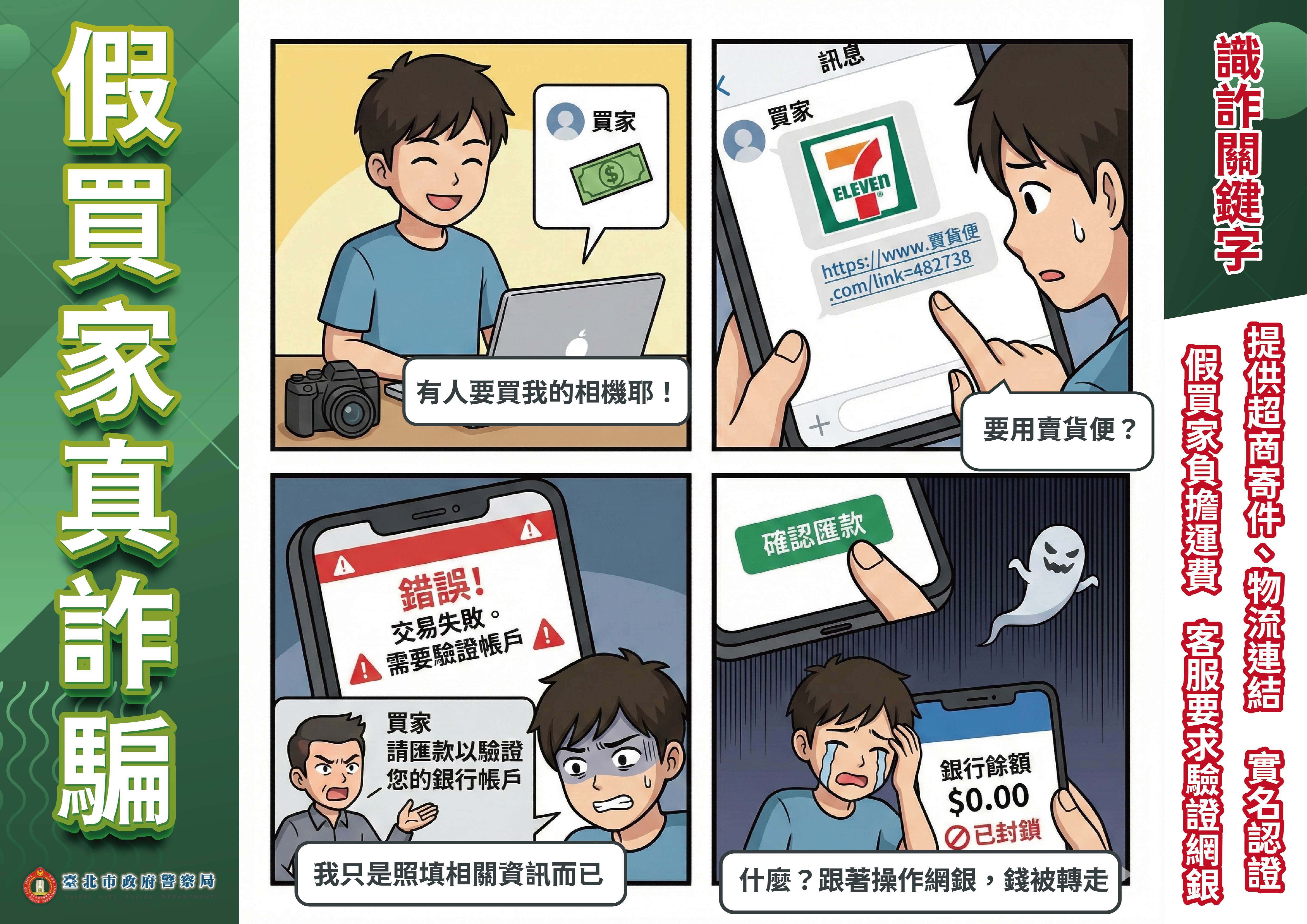 三、近期發現詐騙集團常用「假買家騙賣家」、「假中獎詐 騙」等方式,誘導民眾點擊釣魚連結,騙取個人資料及金 融帳戶等資訊,進而綁定電子支付盜領財物或將其帳戶內款項轉出。為避免詐騙集團藉以行騙,爰彙整宣導圖文素材4張(含114年11月打詐儀錶板數據、4格漫畫案例、宣導 傳單)、影片1部及跑馬燈文字稿1份(如附件),作為12 月宣導主軸,並上傳Google雲端連結供下載,以利各單位 妥適運用於網路資源(官方網站、社群媒體、地方社 群),並全面更新實體宣導(實體課程、智慧螢幕、電視 牆、跑馬燈等)管道素材,提升識詐宣導廣度。